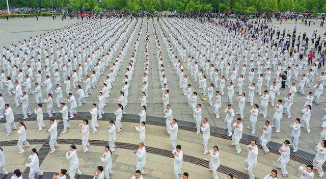 上午8时,伴随着《咱们工人有力量》的雄壮旋律,2000名身着白色太极服的职工方阵走上广场,和着悠扬的音乐,表演者辗转腾挪如云卷云舒,在卢园广场上展开八段锦团体展演。行云流水的动作间,既有白发苍苍的老工匠凝神静气,亦有青年技术骨干刚柔并济。