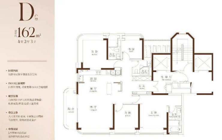 建面约162㎡4房2厅3卫可以封神!客厅和边卧各自做出两个完整的采光面,是常规户型的200%!人在家中坐,门外的自然美景直接就从这270°的奢阔观景视野