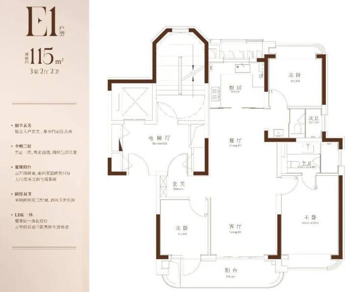 115㎡大三房户型,以及少量两梯两户约162m²改善四房,均为无连廊设计,一楼设置架空层,全精装交付,我们重点聊聊这个市面上稀缺的大三房户型: