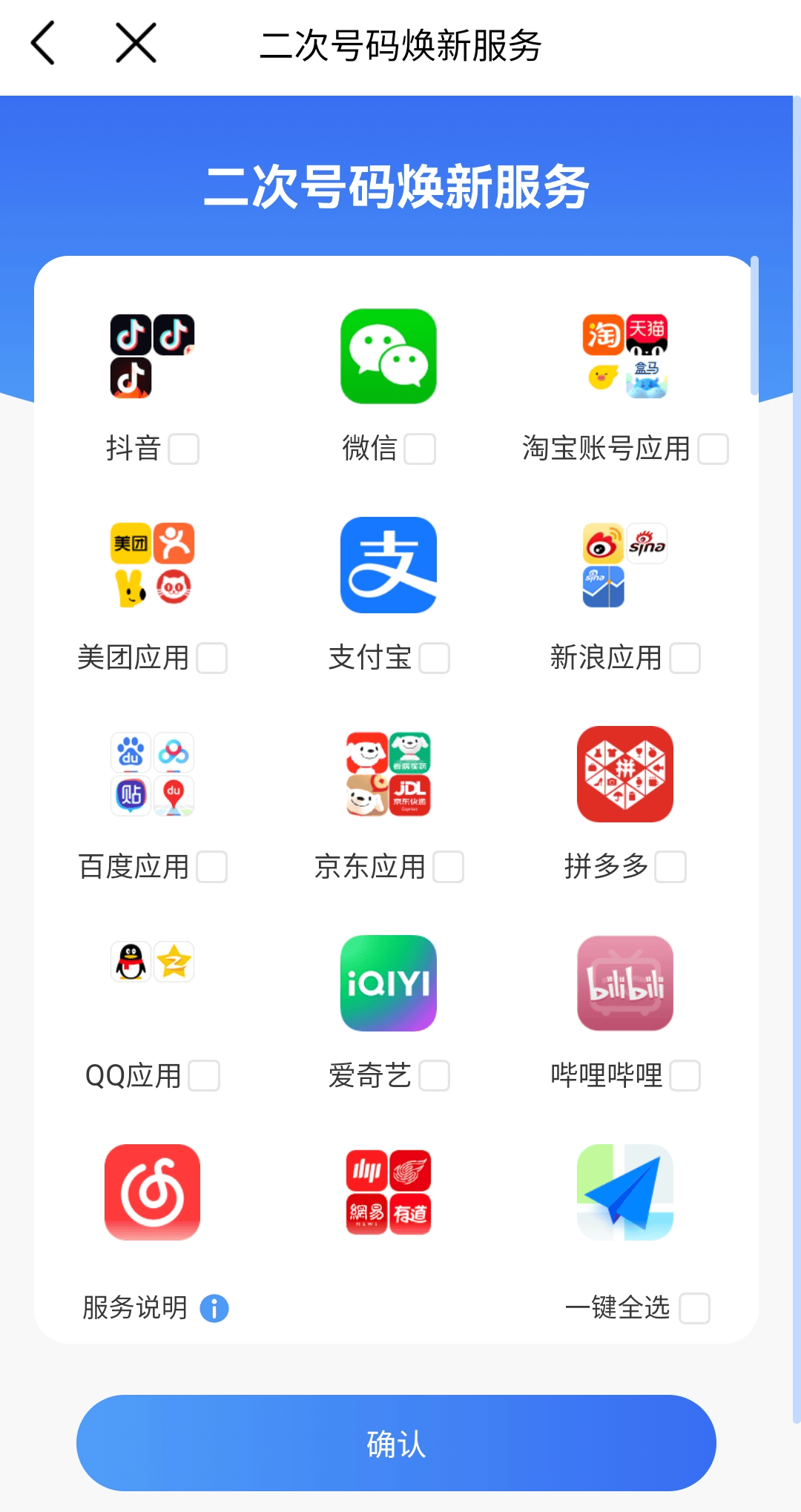用户可通过微信关注“码号服务平台”或“一号通查”公众号,在菜单栏中找到并使用“一键解绑”功能。信息时报记者实测发现,用户可勾选需要解绑的主流互联网应用,覆盖范围广泛,既包括微信、QQ、抖音、淘宝、美团、支付宝、京东、WPS等常用App,也涵盖、钉钉、豆包、顺丰速运等实用工具,甚至包括瓜子二手车、豆瓣、奇富借条等相对小众的应用。