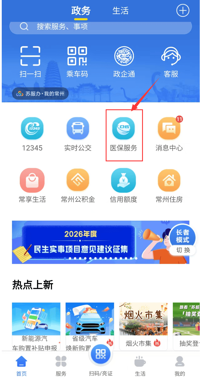 2、登录“我的常州”APP,点击首页【医保服务】-我要办【城乡居民参保登记】。