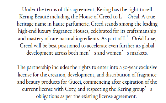 当前古驰香水的授权由科蒂持有,预计新授权将在2028年科蒂现有授权期满后正式启用。