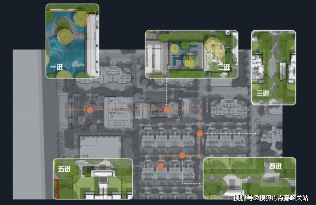 迎宾互动水景、摩卡中心会客、下沉共享庭院、全龄互动乐园、全民慢跑计划、两大美学生活宅间、坊巷入户体系,让业主在每一个角落都能享受放松与悠闲。示意图