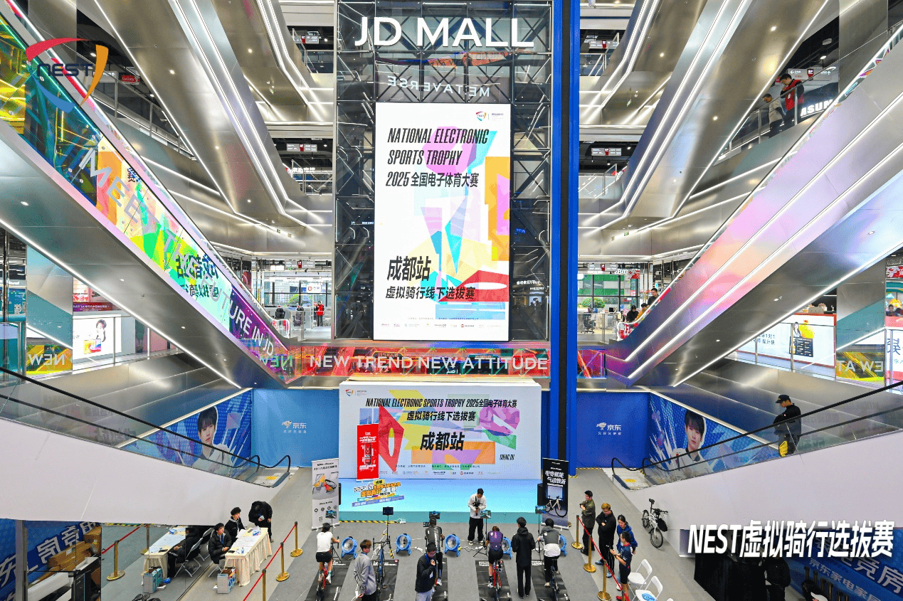 NEST的专业赛道,始终聚焦于虚拟体育的竞技内核。虚拟骑行、虚拟赛艇、虚拟赛车、模拟足球四大项目,全面考验着运动员的体能、技巧与策略。其中,虚拟骑行项目的“六城联动”选拔赛成为今秋一抹亮色,这场巡回赛先后登陆北京、晋江、西安、成都、广州、上海,将高水平的竞技场直接搬进了京东MALL、龙湖天街、上海MOHO等城市核心商圈。